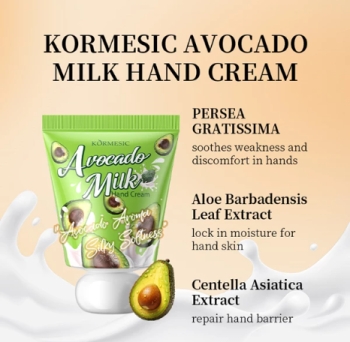 Deskripsi Produk KORMESIC Avocado Milk Hand Cream adalah krim tangan pelembap yang diperkaya dengan esens alpukat dan susu. Formula lembut ini memberikan hidrasi mendalam, membantu melembutkan dan menutrisi kulit tanpa rasa lengket atau berminyak. Dengan aroma segar dan tekstur ringan, krim ini cocok digunakan setiap hari untuk menjaga tangan tetap halus dan segar sepanjang hari.